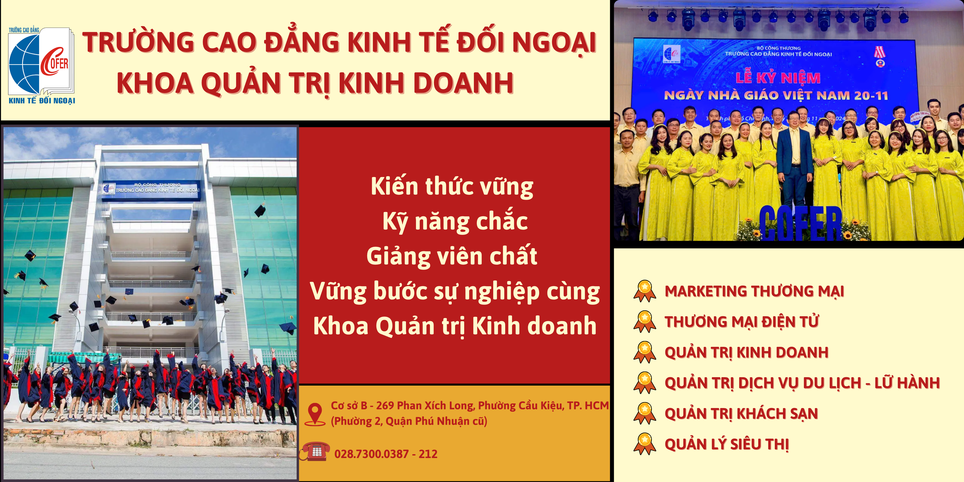 Trường Cao Đẳng Kinh tế Đối ngoại (COFER) là trường Cao đẳng công lập đa ngành, hội nhập quốc tế. Với gần 30 năm kinh nghiệm đào tạo ngành Quản trị Kinh doanh nên nếu bạn là người yêu thích sự năng động, đam mê khởi nghiệp, thích phân tích thị trường và muốn làm chủ tương lai của chính mình – thì ngành Quản trị Kinh doanh tại Trường Cao đẳng Kinh tế Đối ngoại (COFER) chính là sự lựa chọn hoàn hảo dành cho bạn.