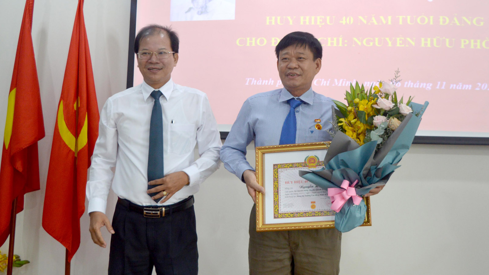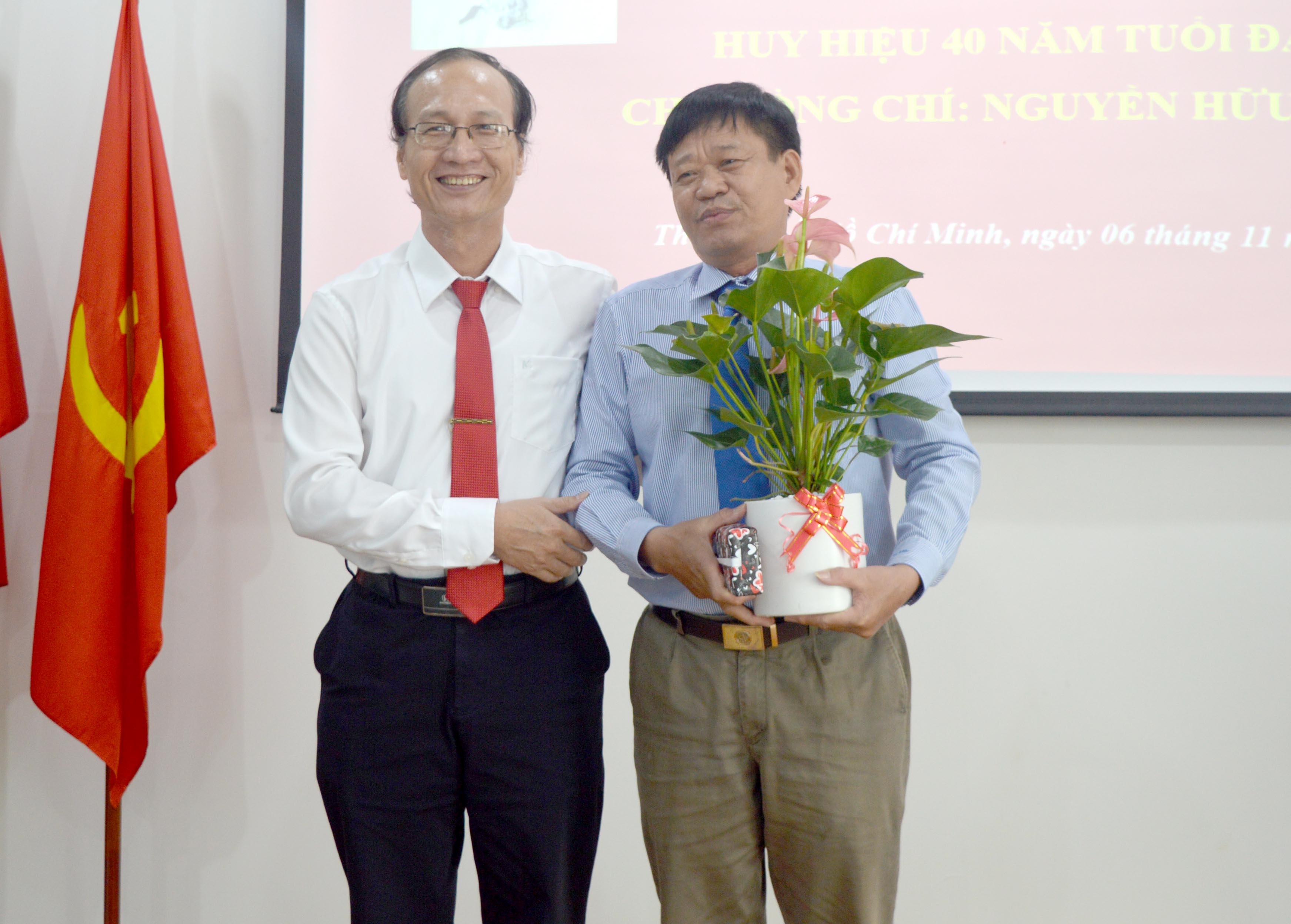 Tại buổi Lễ, đồng chí Nguyễn Thành Thơ đã trang trọng trao tặng Huy hiệu 40 năm tuổi Đảng và hoa chúc mừng đồng chí Nguyễn Hữu Phòng vinh dự được nhận lần này.