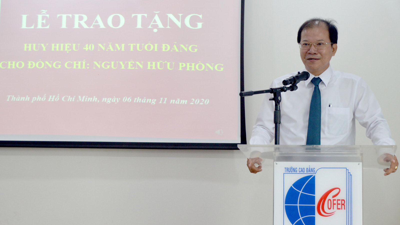 Đồng chí Nguyễn Hữu Phòng đã bày tỏ niềm xúc động, vinh dự trước danh hiệu cao quý mà Đảng trao tặng và gửi lời cảm ơn sâu sắc tới Đảng Ủy Khối cơ sở Bộ Công Thương tại TPHCM, Đảng Ủy, Ban Giám hiệu Trường Cao đẳng Kinh tế Đối ngoại, Chi bộ Hành chính luôn quan tâm, hỗ trợ trong công tác cũng như sinh hoạt của mỗi Đảng viên. Đồng thời, đồng chí hứa sẽ tiếp tục cố gắng hết mình để đóng góp vào việc bồi dưỡng, hướng dẫn các thế hệ Đảng viên trẻ về tư tưởng, bản lĩnh chính trị nhằm góp phần xây dựng, phát triển Đảng bộ Nhà trường ngày càng phát triển, trong sạch và vững mạnh.