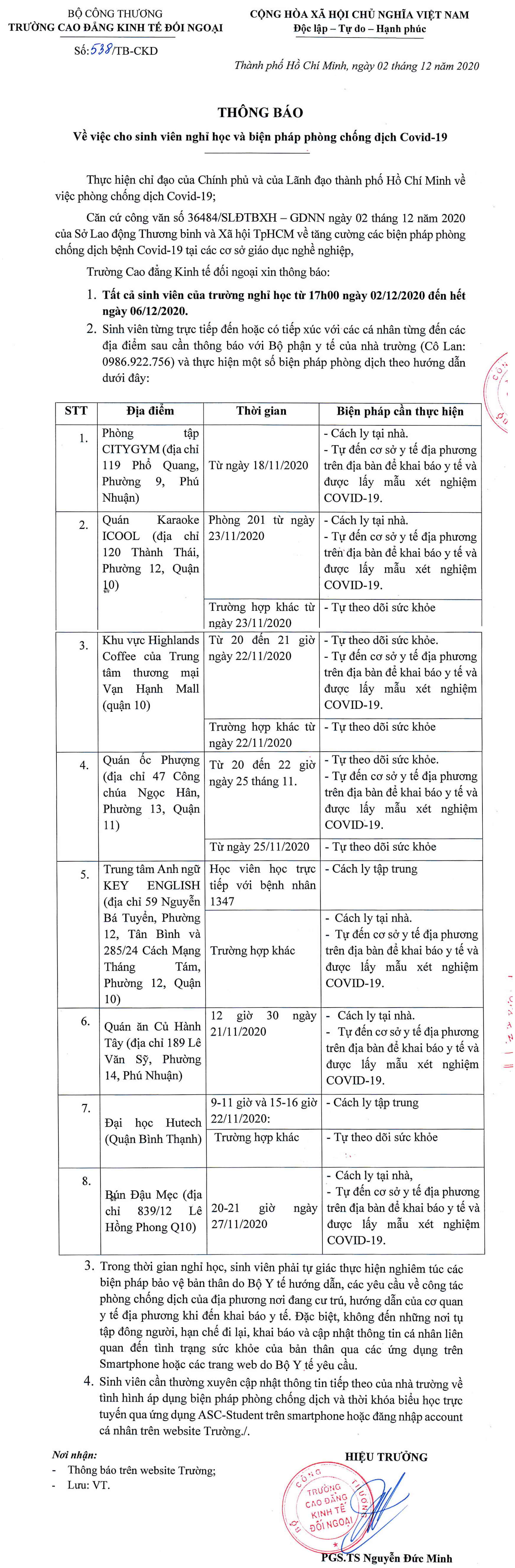 Thông báo về việc cho Sinh viên nghỉ học và biện pháp phòng chống dịch Covid-19