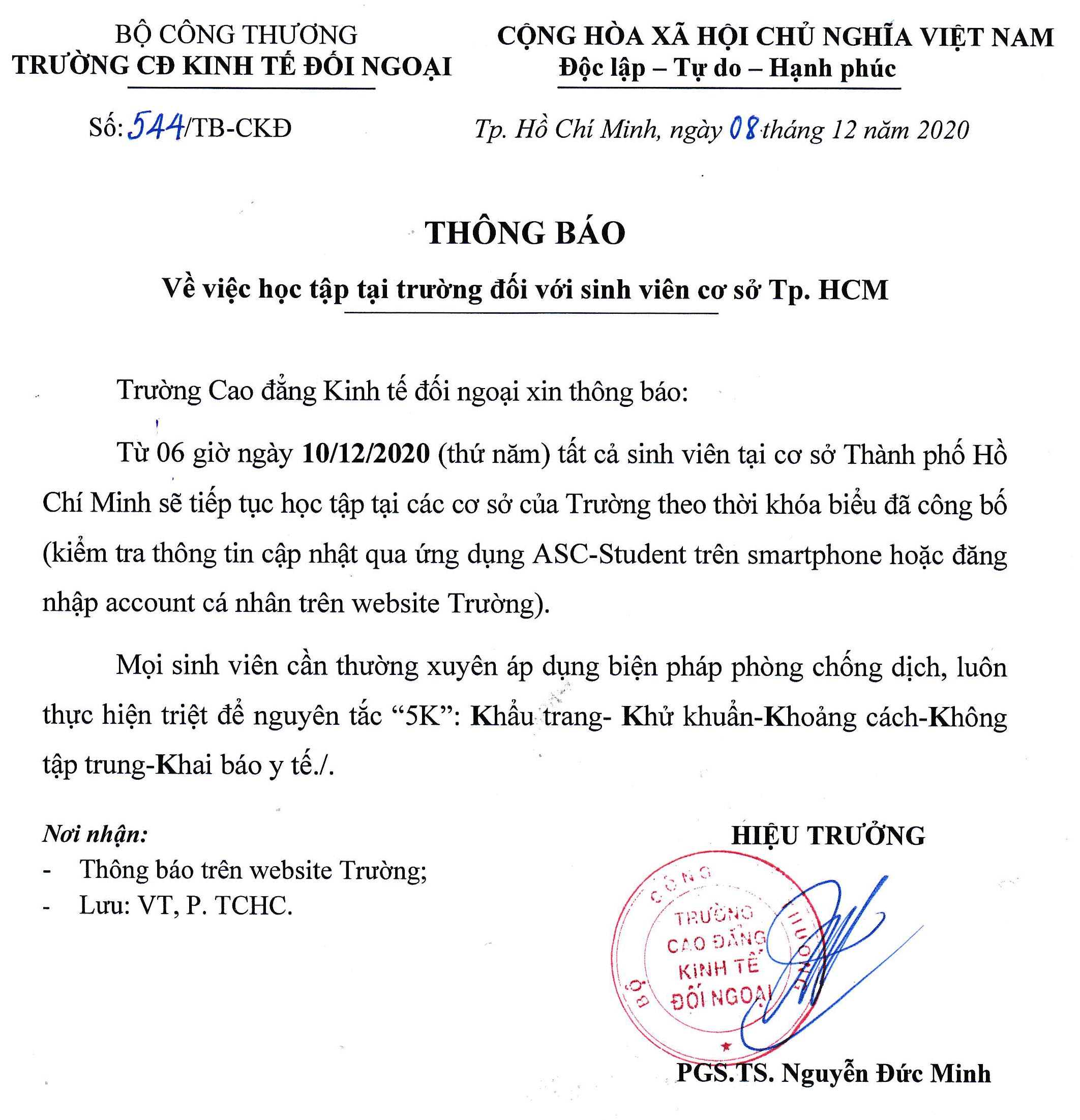 Thông báo về việc học tập tại trường đối với sinh viên cơ sở Thành phố Hồ Chí Minh