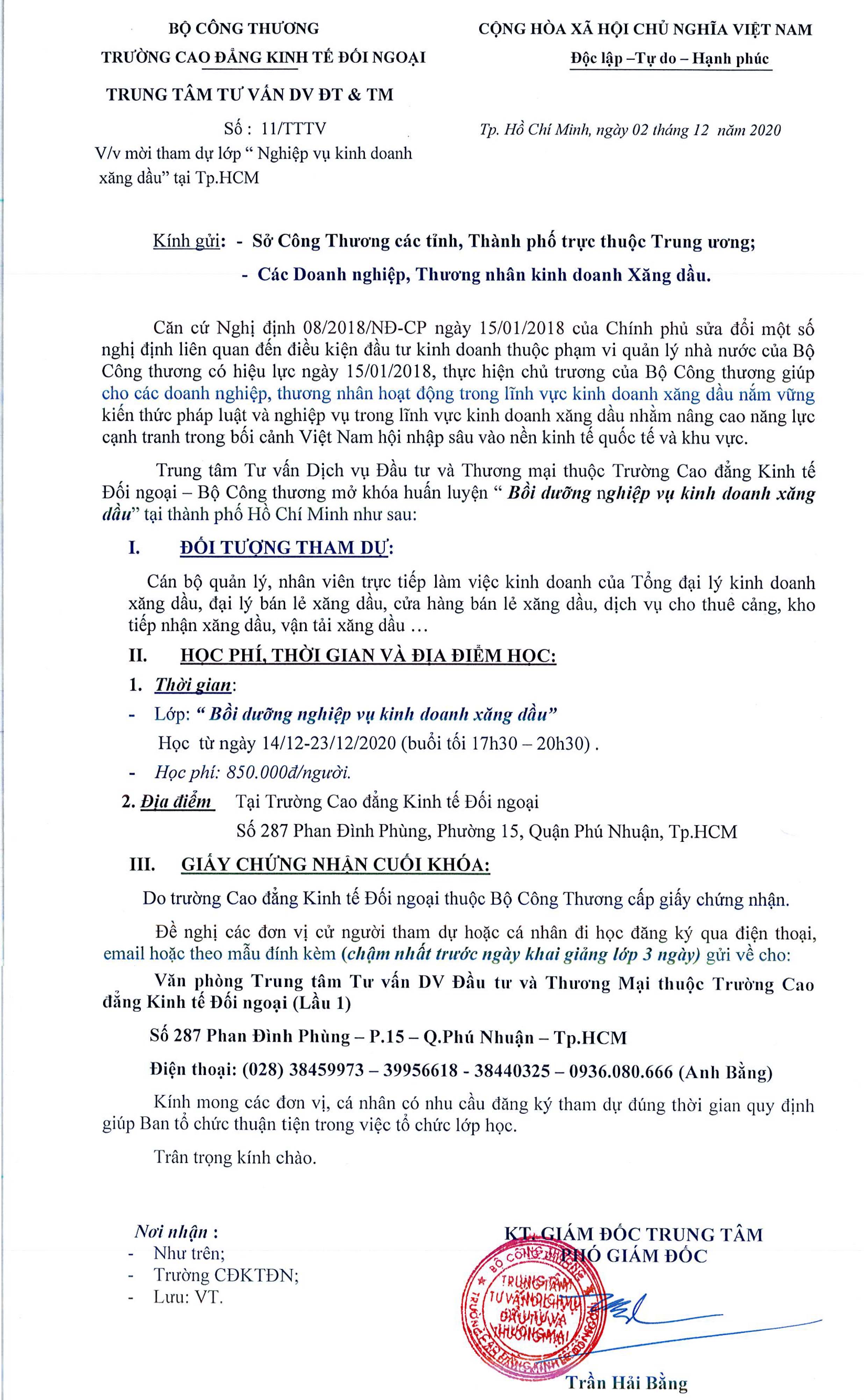 Thông báo về việc mời tham dự lớp "Nghiệp vụ kinh doanh xăng dầu" tại Tp.HCM