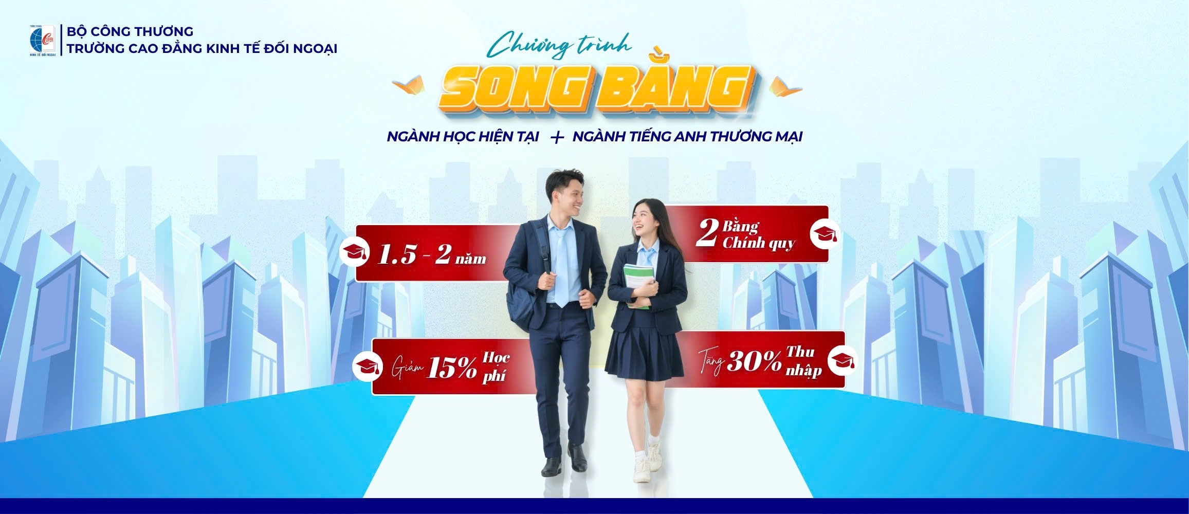 Trong bối cảnh hội nhập quốc tế, sinh viên không chỉ cần vững chuyên môn mà còn phải thành thạo tiếng Anh trong môi trường kinh doanh. Chương trình song bằng ngành Tiếng Anh Thương mại tại Trường Cao đẳng Kinh tế Đối ngoại (COFER) giúp sinh viên đạt được cả hai mục tiêu trên. Chỉ trong khoảng 1,5 – 2 năm, sinh viên có thể hoàn thành chương trình và nhận 02 bằng cử nhân, từ đó mở rộng cơ hội nghề nghiệp sau khi tốt nghiệp.