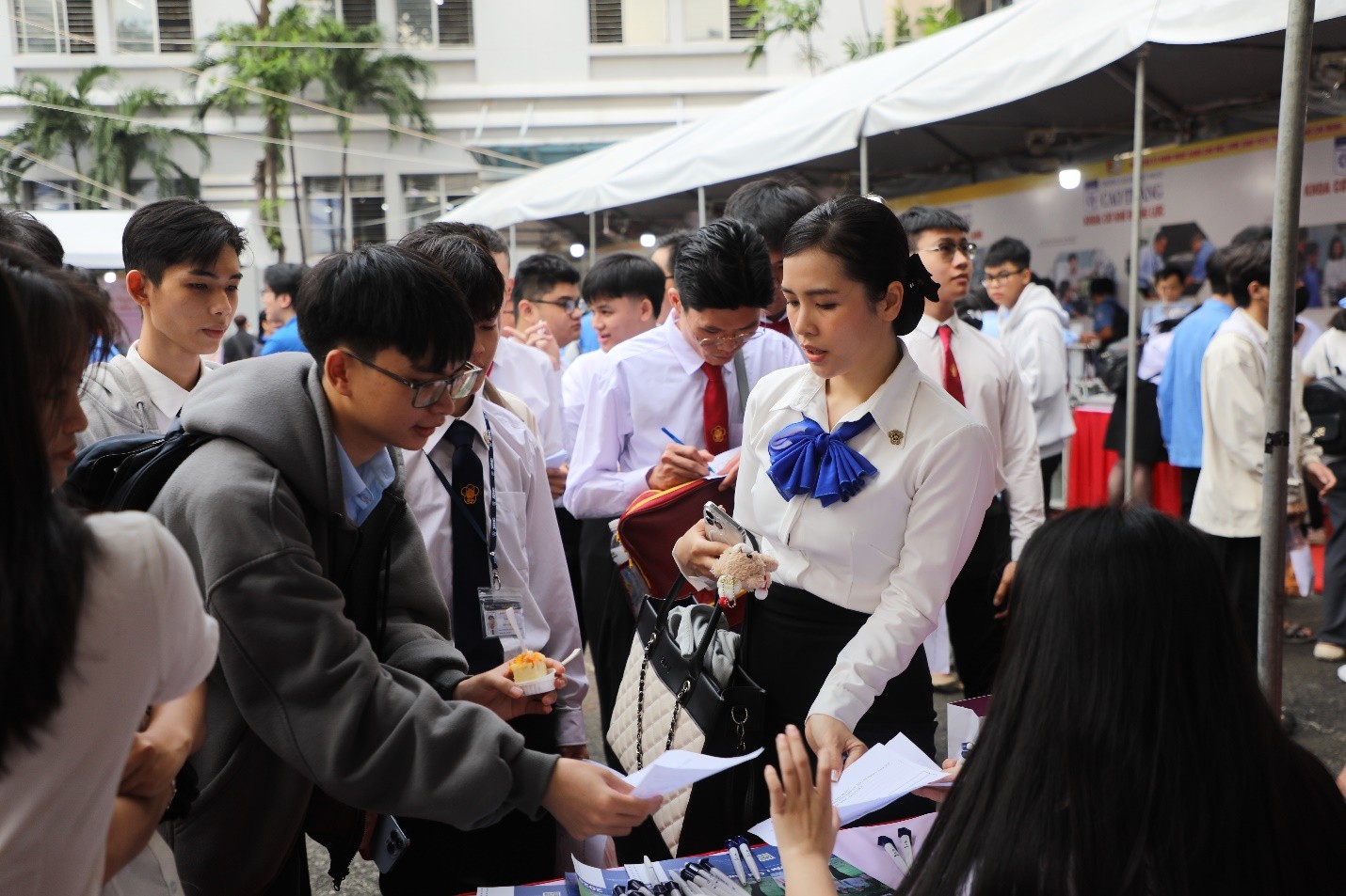 Đặc biệt, tại gian hàng còn có sự tham gia của doanh nghiệp đối tác đồng hành cùng Nhà trường, chia sẻ về cơ hội thực tập, việc làm và chương trình hợp tác đào tạo trong lĩnh vực du lịch – khách sạn. Đây là dịp để học sinh, sinh viên được lắng nghe những câu chuyện nghề thực tế, tiếp cận thông tin về nhu cầu tuyển dụng và định hướng nghề nghiệp rõ ràng hơn. Song song đó, đội ngũ giảng viên và sinh viên của trường cũng trực tiếp tư vấn hướng nghiệp, giúp các bạn học sinh hiểu thêm về năng lực bản thân, triển vọng nghề nghiệp và cơ hội phát triển trong môi trường học tập hiện đại, gắn kết doanh nghiệp của COFER.