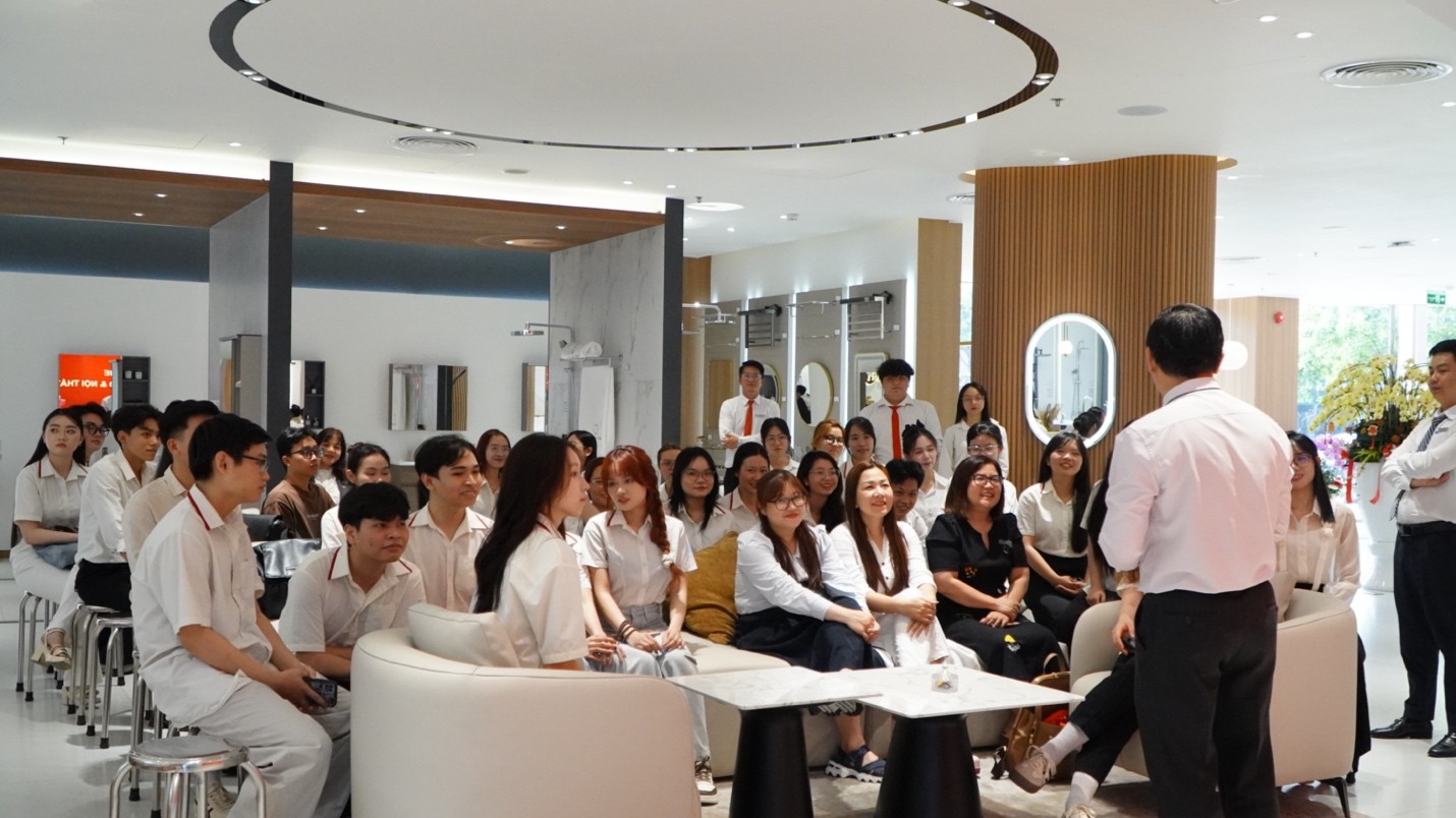 Các bạn sinh viên đã trực tiếp tham quan không gian văn phòng hiện đại và khu vực showroom trưng bày. Tại đây, những kiến thức về trưng bày hàng hóa, quản trị trải nghiệm khách hàng và các dòng sản phẩm chủ lực của doanh nghiệp đã được hiện thực hóa một cách sinh động, với sự dẫn dắt của anh Nguyễn Thanh Hòa - Phó Trưởng Phòng Kinh doanh Dự án Hoa Sen Home, giúp các bạn hiểu rõ tiêu chuẩn khắt khe để một sản phẩm chiếm trọn niềm tin người tiêu dùng.