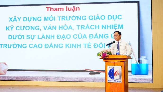 Nhằm làm rõ hơn những kết quả đạt được cũng như chia sẻ kinh nghiệm thực tiễn, Hội nghị đã lắng nghe hai tham luận tiêu biểu. Tham luận thứ nhất với chủ đề “Đẩy mạnh chuyển đổi số trong công tác Đảng tại tổ chức Đảng cơ sở đáp ứng yêu cầu quản lý, lãnh đạo trong tình hình mới” do Chi bộ Hành chính trình bày, tập trung phân tích vai trò của chuyển đổi số trong nâng cao hiệu quả công tác lãnh đạo, quản lý của tổ chức Đảng. Tham luận thứ hai với chủ đề “Xây dựng môi trường giáo dục kỷ cương, văn hóa, trách nhiệm dưới sự lãnh đạo của Đảng ủy Trường Cao đẳng Kinh tế Đối ngoại” do Chi bộ Giáo viên 2 trình bày, nhấn mạnh vai trò nêu gương, kỷ cương và văn hóa trong môi trường giáo dục nghề nghiệp.