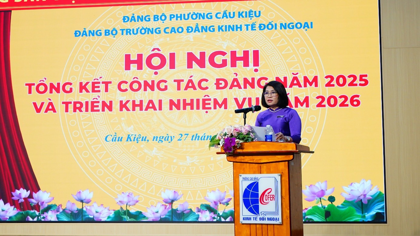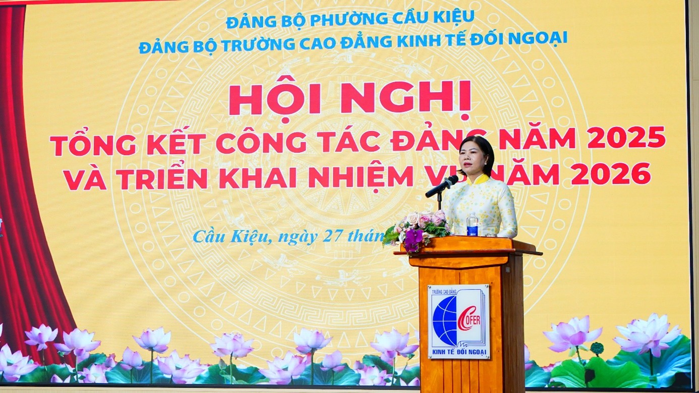 Hội nghị cũng vinh dự đón tiếp và lắng nghe ý kiến phát biểu chỉ đạo của đồng chí Nguyễn Thị Kiều Nhi – Phó Bí thư Thường trực Đảng ủy Phường Cầu Kiệu. Đồng chí ghi nhận, đánh giá cao những kết quả mà Đảng bộ Trường Cao đẳng Kinh tế Đối ngoại đã đạt được trong năm 2025, đồng thời định hướng một số nhiệm vụ trọng tâm nhằm tiếp tục nâng cao chất lượng công tác xây dựng Đảng, gắn với thực hiện hiệu quả nhiệm vụ chính trị của Nhà trường trong thời gian tới.