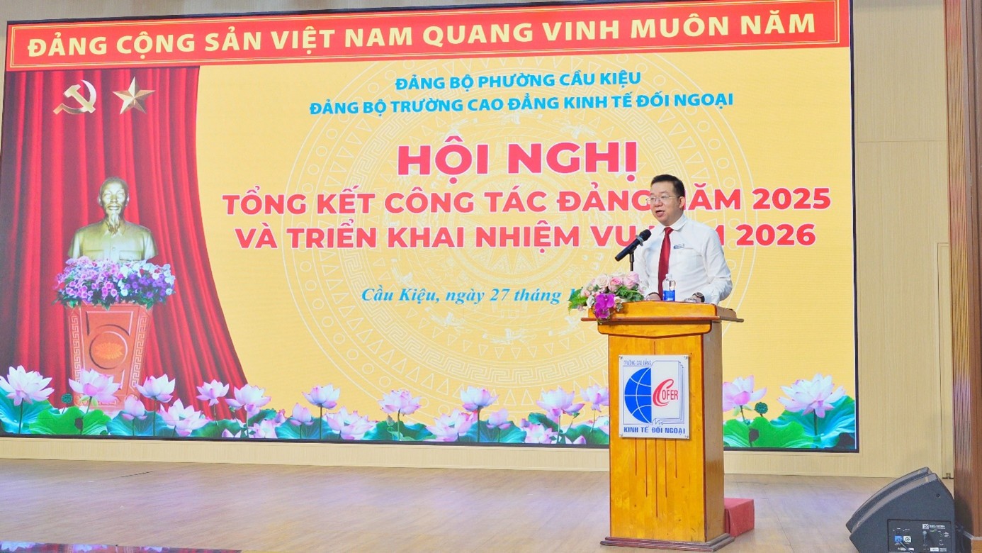 Hội nghị tổng kết công tác Đảng năm 2025 của Trường Cao đẳng Kinh tế Đối ngoại đã diễn ra trong không khí nghiêm túc, trách nhiệm, đoàn kết và thống nhất cao. Kết quả Hội nghị là cơ sở quan trọng để Đảng bộ Nhà trường tiếp tục phát huy vai trò lãnh đạo toàn diện, nâng cao năng lực và sức chiến đấu của tổ chức Đảng, góp phần thực hiện thắng lợi các mục tiêu phát triển của Nhà trường trong năm 2026 và những năm tiếp theo.
