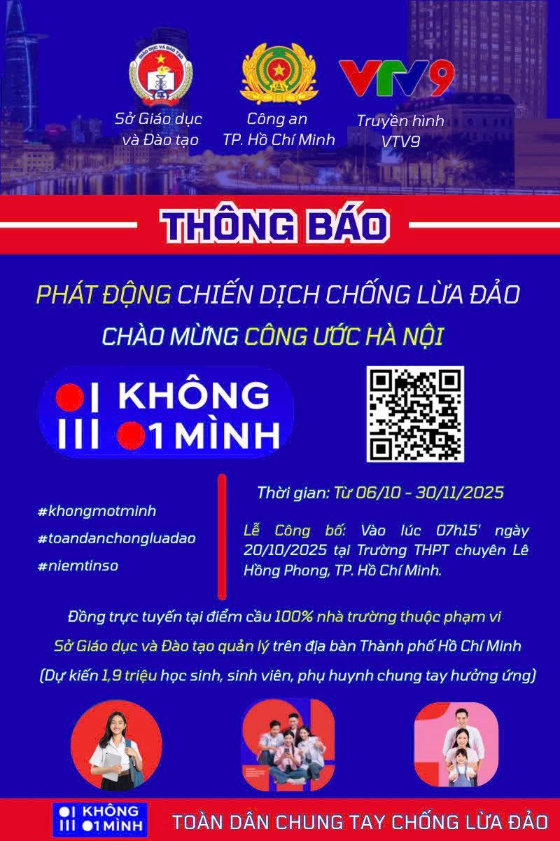 Trước sự gia tăng của tội phạm công nghệ cao và các hành vi lừa đảo trực tuyến, Công an Thành phố Hồ Chí Minh phối hợp cùng Sở Giáo dục và Đào tạo TP. Hồ Chí Minh và Đài Truyền hình VTV9 đã chính thức phát động Chiến dịch “Không một mình – Toàn dân chống lừa đảo”, nhằm nâng cao nhận thức của người dân, đặc biệt là học sinh, sinh viên, về an toàn thông tin và trách nhiệm công dân trên không gian mạng.
