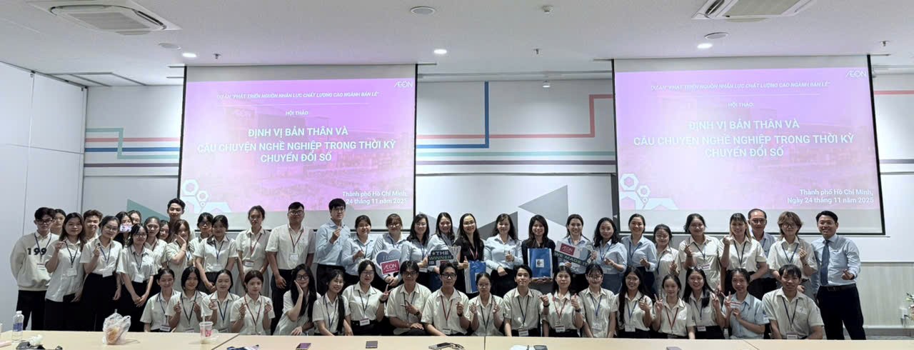 Ngày 24/11/2025, Khoa Quản trị Kinh doanh - Trường Cao đẳng Kinh tế Đối ngoại đã phối hợp cùng AEON Việt Nam tổ chức thành công chương trình Thực tế nghề nghiệp & Workshop “Định vị bản thân” dành cho sinh viên khối ngành Quản trị Kinh doanh Khóa 28 và Quản lý Siêu thị Khóa 29. Sự kiện thu hút hơn 180 sinh viên tham dự tại AEON Hall – AEON Celadon Tân Phú.