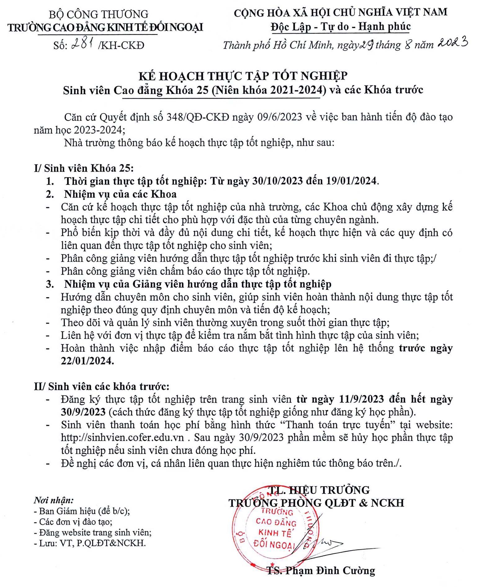 Thông báo kế hoạch thực tập tốt nghiệp dành cho sinh viên Cao đẳng Khóa 25 (niên khóa 2021-2024) và các Khóa trước
