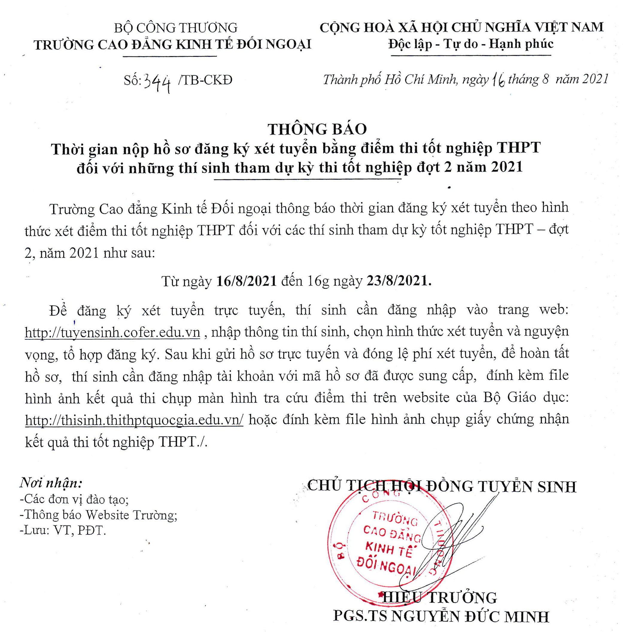 Thông báo về thời gian nộp hồ sơ xét tuyển bằng điểm thi tốt nghiệp THPT đối với những thí sinh tham dự kỳ thi tốt nghiệp đợt 2 năm 2021
