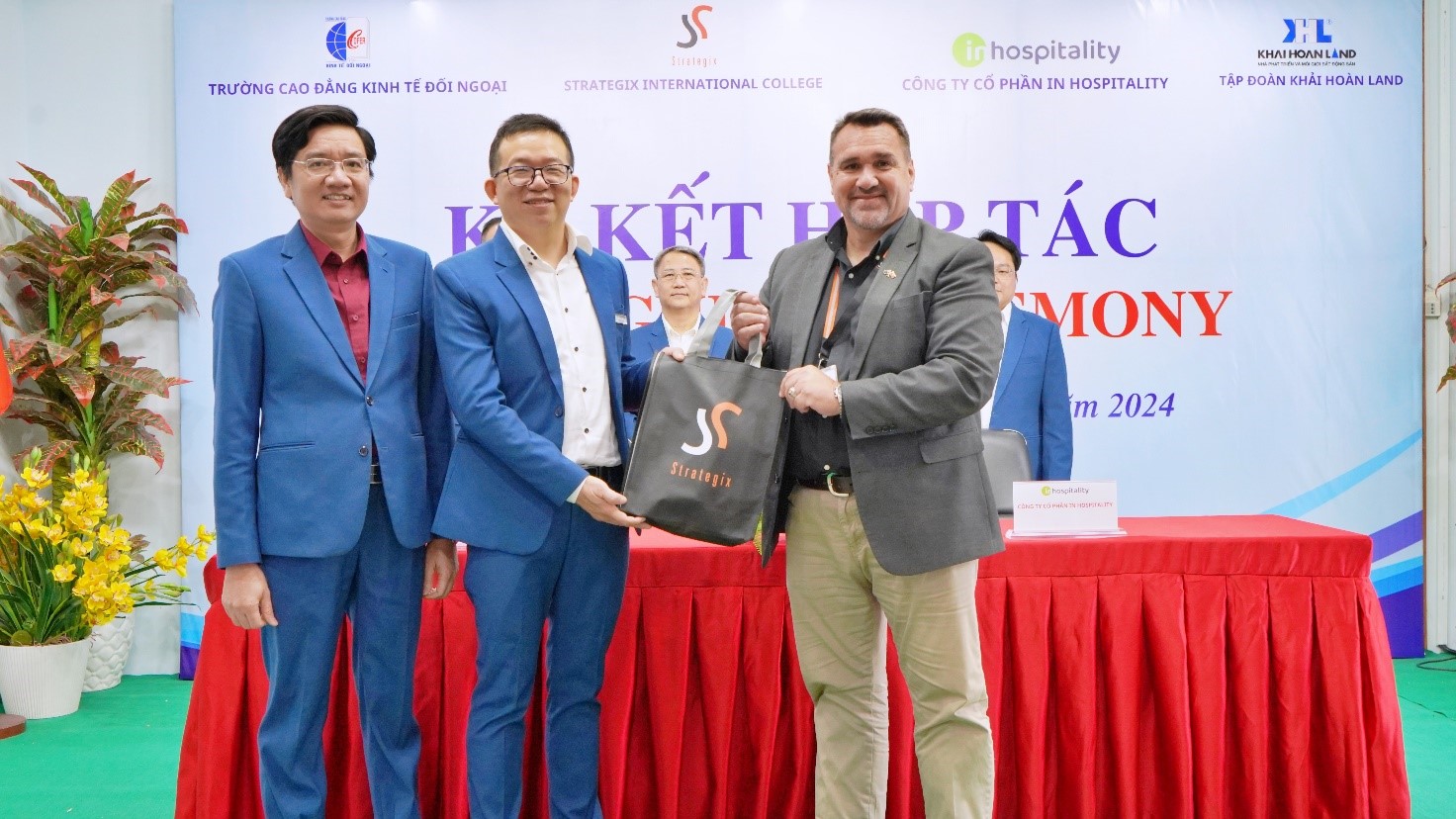 Sáng ngày 08/4/2024, tại Hội trường A305, cơ sở 287 Phan Đình Phùng, Phường 15, Quận Phú Nhuận, TP.HCM đã tổ chức lễ ký kết hợp tác thiết lập mối quan hệ trên lĩnh vực thương mại và dịch vụ với Trường Cao đẳng Quốc tế Strategix (Strategix International College), Công ty cổ phần IN Hospitality và Công ty Cổ phần Tập đoàn Khải Hoàn Land.